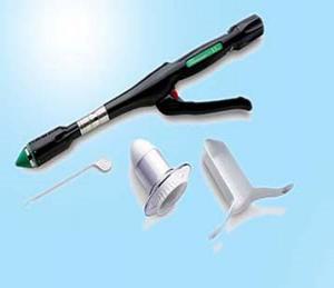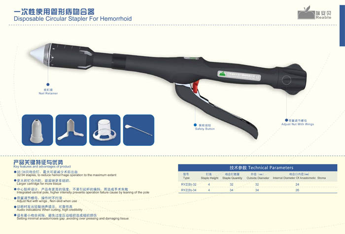 一次性使用肛肠吻(缝)合器手术是以环形刀将齿状线上方的粘膜及粘膜下层环形切除,同时击入成圆形排列的两排互相交错的缝钉将切口闭合。应用该器械可以节省手术时间、减少病员出血、能更方便地进行手术缝合。本器械有三种规格32mm、34mm、36mm以适应不同组织。