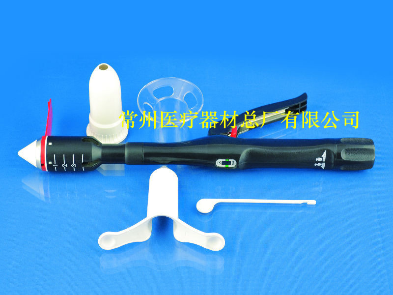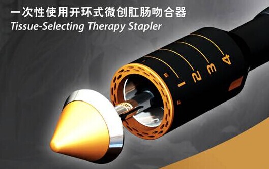 一次性痔疮吻合器,一次性使用肛肠吻(缝)合器手术是以环形刀将齿状线上方的粘膜及粘膜下层环形切除,同时击入成圆形排列的两排互相交错的缝钉将切口闭合。应用该器械可以节省手术时间、减少病员出血、能更方便地进行手术缝合。本器械有三种规格32mm、34mm、36mm以适应不同组织。