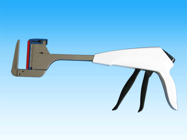 一次性使用直线闭合器,一次性使用直线吻(缝)合器是在组织上击入成直线排列的两排互相交错的缝钉,来代替手工进行手术缝合。应用该器械可以节省手术时间、减少病员出血、能更方便地进行手术缝合。本器械有五种规格以适应不同组织:30mm,45mm,60mm,75mm,90mm。另外可调的缝钉高度分别有:3.8和4.5mm,以弥补各种厚度的组织。