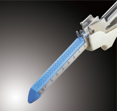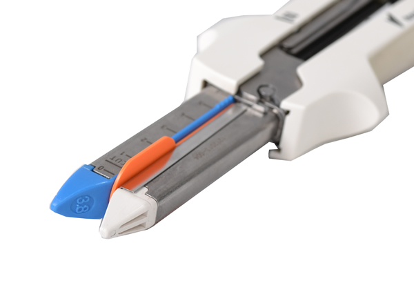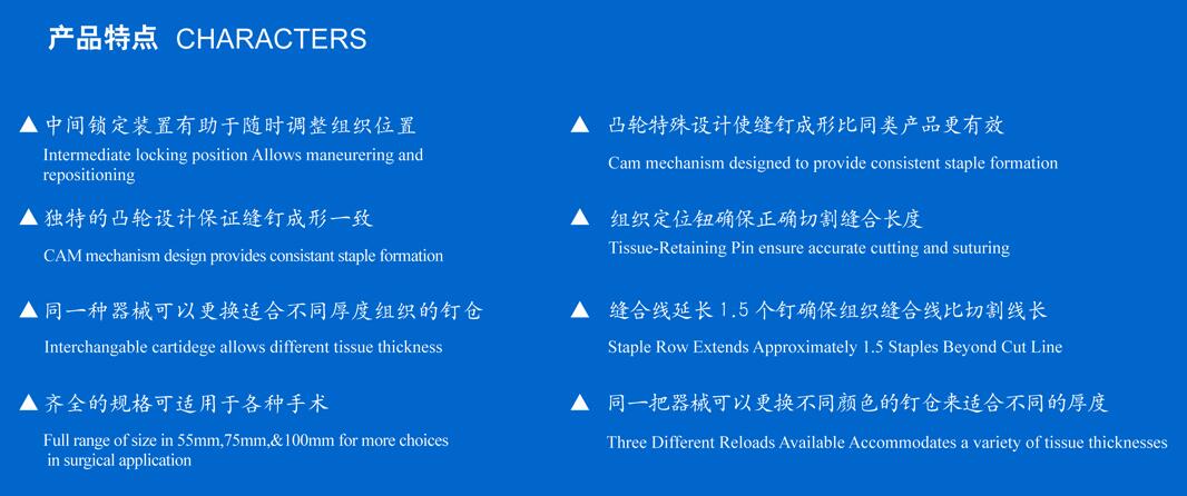 直线切割吻合器,一次性直线切割吻合器是在组织上击入成直线排列的四排互相交错的缝钉,组件内的切割刀同步将组织离断。应用该器械可以节省手术时间、减少病员出血、能更方便地进行手术缝合。本器械有六种规格以适应不同组织:55mm,60mm,75mm,80mm,90mm,100mm。另外可调的缝钉高度分别有:2.5mm,3.85和4.5mm,以弥补各种厚度的组织。